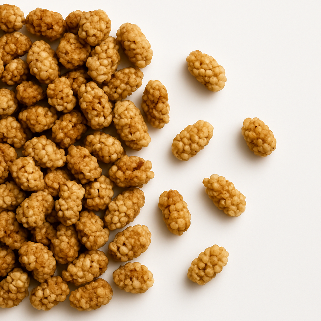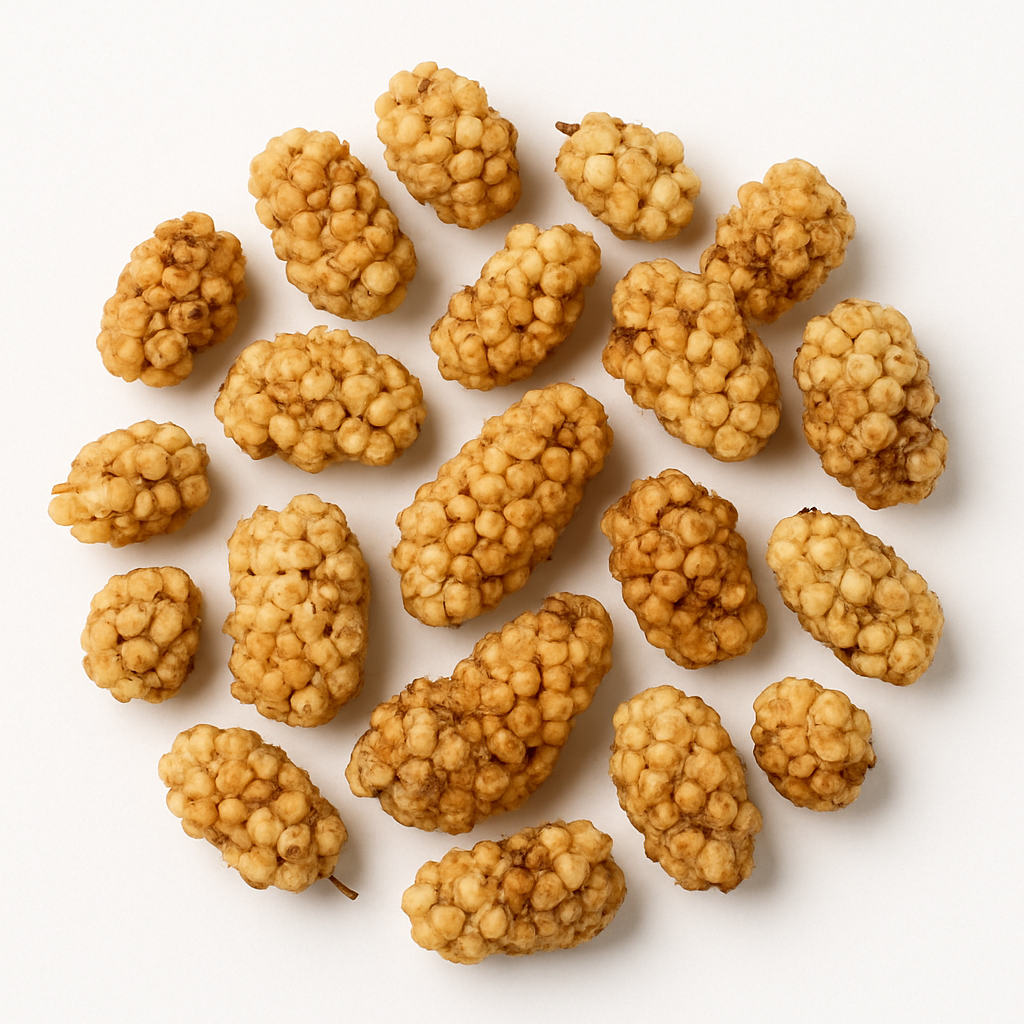 Hele soltørrede morbær. De beigefarvede bær er normalt faste i konsistensen og har en sød smag, der minder om honning og karamel. De er en kilde til fibre og egner sig som snack og naturligt sød energikilde, til blandinger samt til madlavning og bagning.