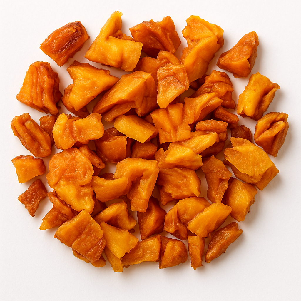 Tørrede og for det meste uregelmæssigt skårne, overvejende orangefarvede mangostykker. De frugtagtige og fiberrige stykker er velegnede til müsli og andre blandinger samt til madlavning og bagning.