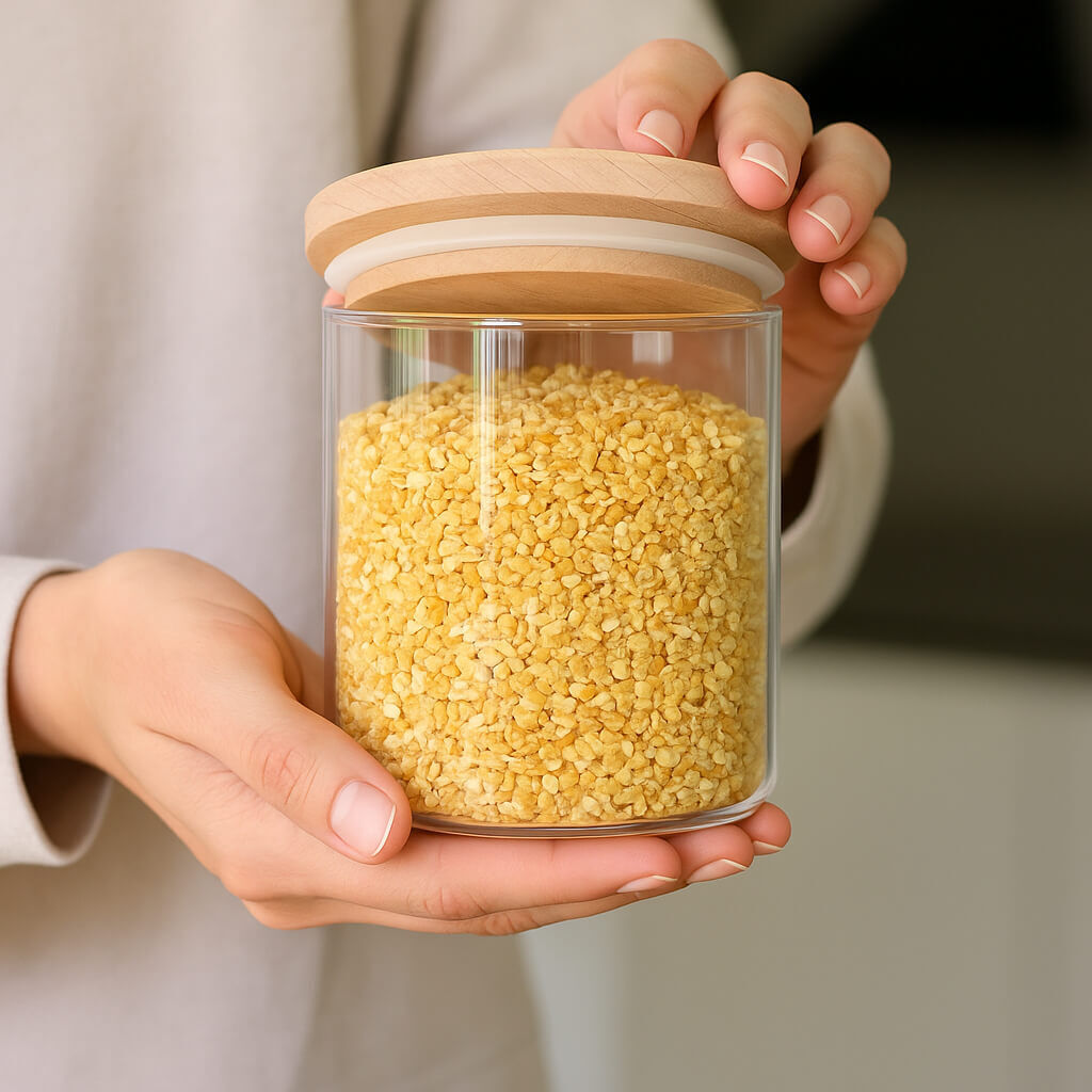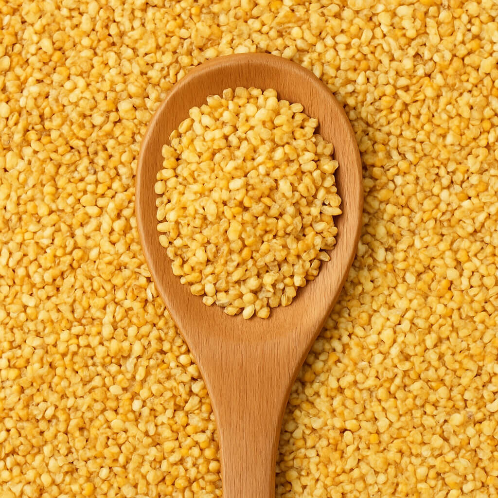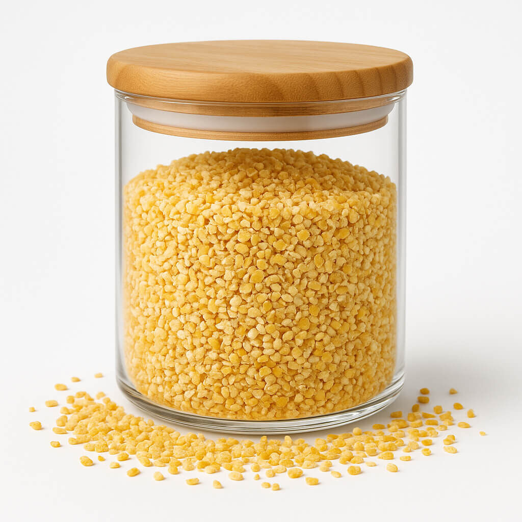 Guldfarvede til mørkebrune sojagranulat. Det smager ret neutralt og egner sig derfor til både søde og salte retter. Det er rig på protein og kostfibre.