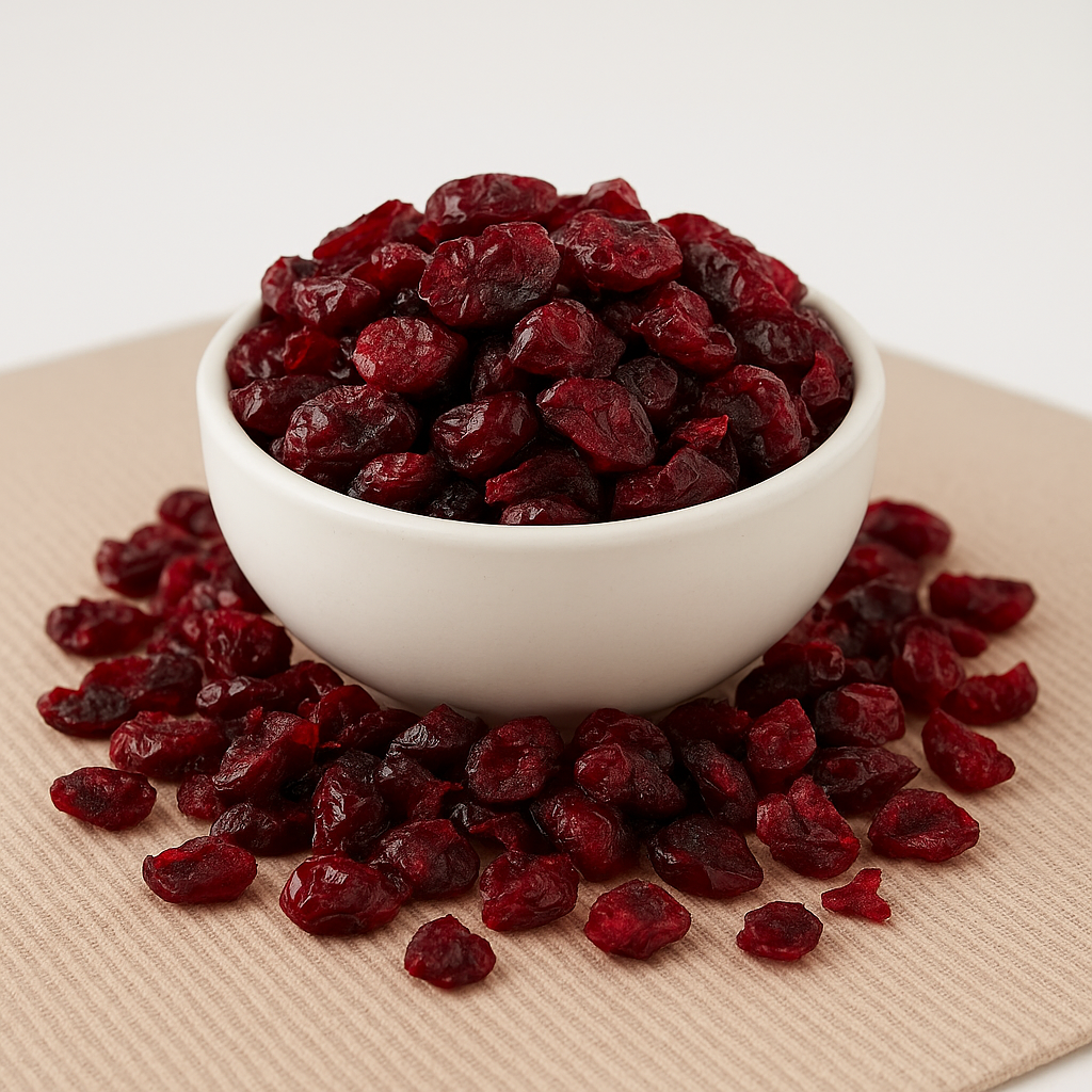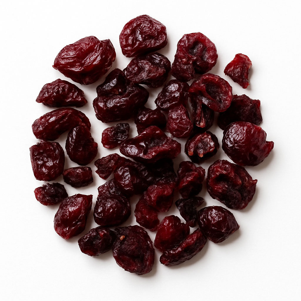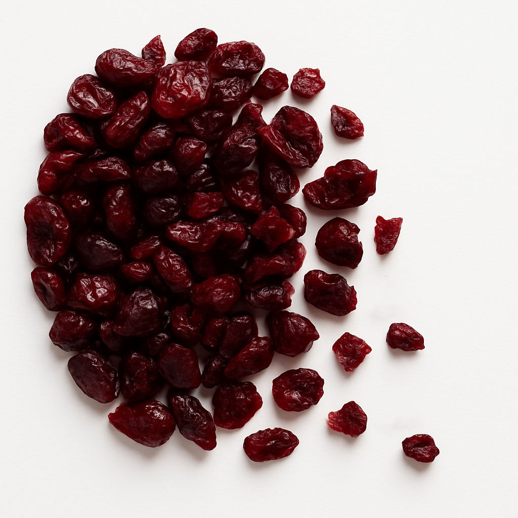 Tørrede tranebær sødet med rørsukker. De mest halve bær er mørkerøde til brunlige, bløde og har en frugtagtig, syrlig og sød smag. Tranebær er en god kilde til fibre. De er alsidige og kan bruges i müsli, nødde- og frugtblandinger, madlavning og bagning.